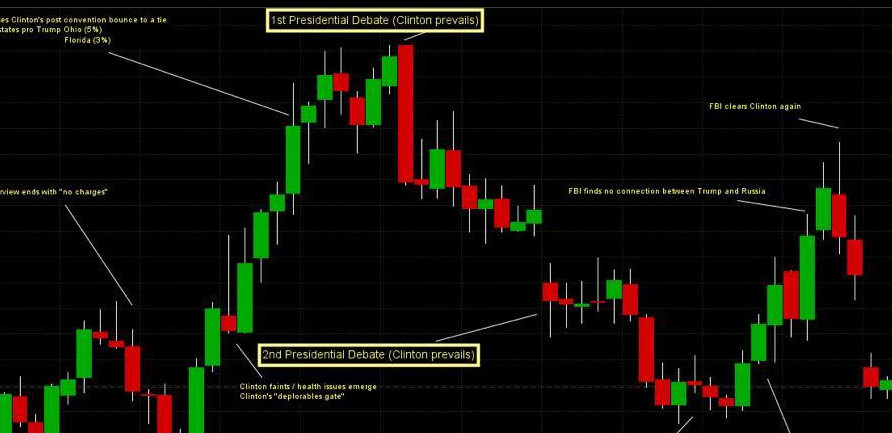 Τα πιο αισθητά παραδείγματα είναι οι ρευστοποιήσεις δολαρίου στις 27 Σεπτεμβρίου και 10 Οκτωβρίου όπου ήταν ορατό ότι οι αγορές πίστευαν πως η Χίλαρι κέρδισε τα δύο πρώτα debate αλλά και η συσσώρευση υπέρ του δολαρίου που ακολούθησε στις 28 Οκτωβρίου όπου το FBI ανακοίνωσε πως η υπόθεση της Κλίντον δεν έχει κλείσει, ενώ ταυτόχρονα λίγες μέρες αργότερα το FBI ανακοίνωσε πως δεν υπάρχει καμία σχέση μεταξύ Τραμπ, Ρωσίας και κυβερνοεπιθέσεων για τις οποίες τον κατηγορούσαν οι Δημοκρατικοί.
