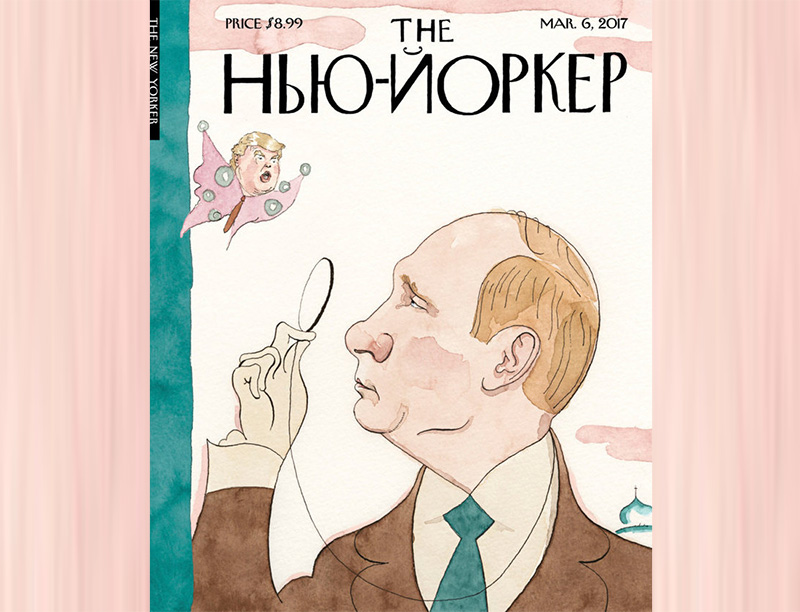 Στο νέο τεύχος του που κυκλοφόρησε το πρωί της Δευτέρας παρουσιάζει τον πρόεδρο των ΗΠΑ ως μια μικρή ροζ πεταλούδα που πετά, την ώρα που ο Πούτιν την παρατηρεί ψυχρά μέσα από ένα μονόκλ.