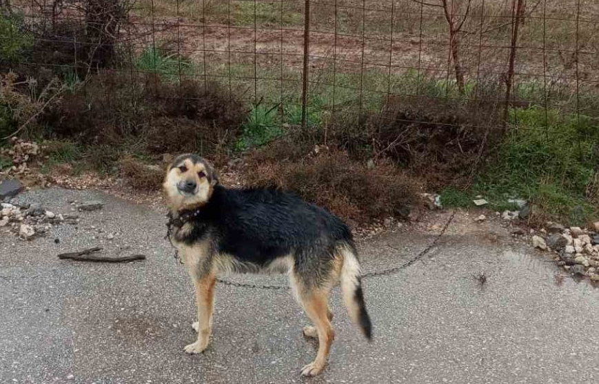 Μια σκυλίτσα μέσα στη βροχή, χωρίς κατάλυμα, χωρίς φαγητό και νερό, δεμένη με μακριά αλυσίδα σε ένα σύρμα, η οποία για να προστατευτεί από το κρύο και τη βροχή είχε σκάψει ένα λάκκο στο χώμα, που όμως είχε γεμίσει νερό από την έντονη βροχόπτωση!
