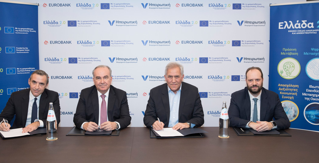 Στην υπογραφή σύμβασης χρηματοδότησης €50,3 εκατ. με την Ηπειρωτική Βιομηχανία Εμφιαλώσεων Α.Ε. προχώρησε η Eurobank, με τη συμμετοχή του Ταμείου Ανάκαμψης και Ανθεκτικότητας (ΤΑΑ) για τη χρηματοδότηση επένδυσης συνολικού ύψους €62,8 εκατ. που υλοποιεί η εταιρεία στο πλαίσιο του Εθνικού Σχεδίου Ανάκαμψης και Ανθεκτικότητας «Ελλάδα 2.0» με πόρους της Ευρωπαϊκής Ένωσης – NextGenerationEU.